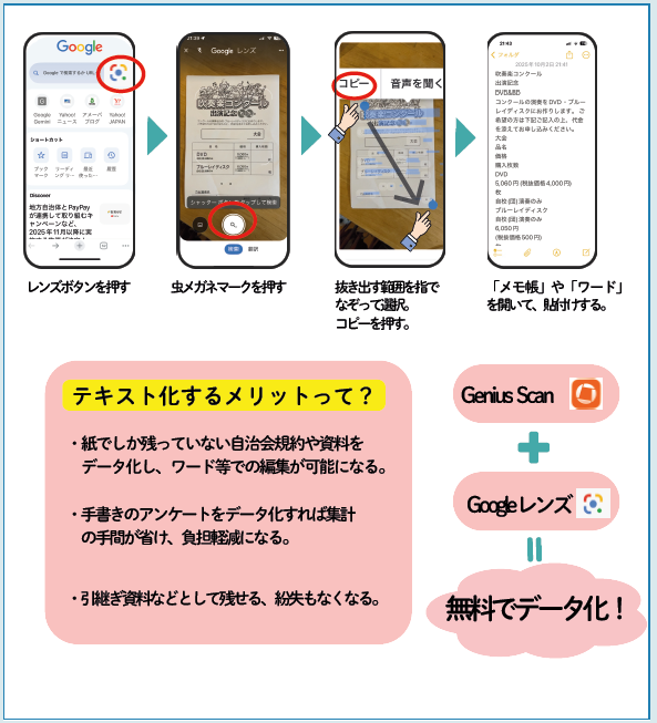 紙ベースでしか手元に届かない配布物を ①PDF化する方法 ②文字を読み取りテキストデータ化する方法 の2つを本記事ではお伝えします。